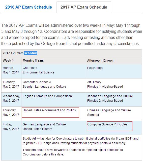 P.S.:紅框內為有變動的科目,美國政府與政治和AP微積分AB&BC考試時間互換;原來考歐洲史的時間,改為考新增科目計算機科學原理,歐洲史則改為和拉丁語一起考。