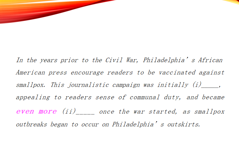 ● appealing to readers sense of communal duty 這個動詞分詞詞組在This journalistic campaign was initially (i)_____, 之后,作為伴隨狀語(功能是解釋說明具體情況,或者介紹隨之而來的結果),可見空白處的詞的具體表現形式是 appealing to readers sense of communal duty,那么【A】就很明顯了,即使不認識【A】,也可以通過排除兩外兩個備選得出。