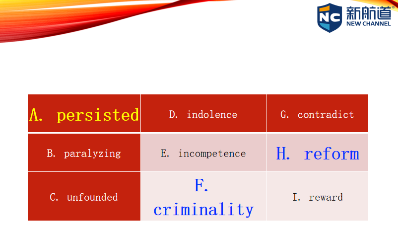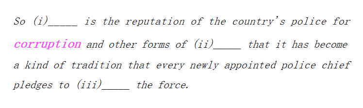 ● 首先,發現這是一個so … that …句型。邏輯是“【因為】the reputation of the country's police for corruption and other forms of (ii)_____很怎么怎么樣,【所以】it has become a kind of tradition that every newly appointed police chief pledges to (iii)_____ the force”。這個因果關系(因與果應為【同向的】)就是破解句子的絕對關鍵依據了。