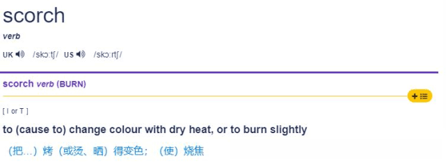 我們今天要討論的“曬”更針對于天氣來講,是比熱要更高一個level,所以用hot表達就顯得有點不合適了,英文中有個詞比較合適,那就是scorch這個詞。