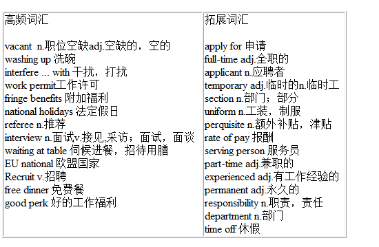 1. answer(ing)(the)phone 題干中的定位詞type of work對應錄音中男士的what sort of work,考生可據此在其附近的句子中尋找答案,其中washing up是干擾內容,針對what sort of work的提問,錄音中女士給出了answering the phone的答案。