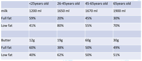 In the first table, people under 25 drink 1,200 ml of milk, while approximately 1,660 ml is consumed by those between 25-44 and 45-65. The figure for senior citizens over 65 years old is by far the highest, at 1,800 ml. Only people younger than 25 drink more full-fat milk, at 59%, while people in the other three groups more favour low-fat milk, at 80%, 55% and 70% respectively.