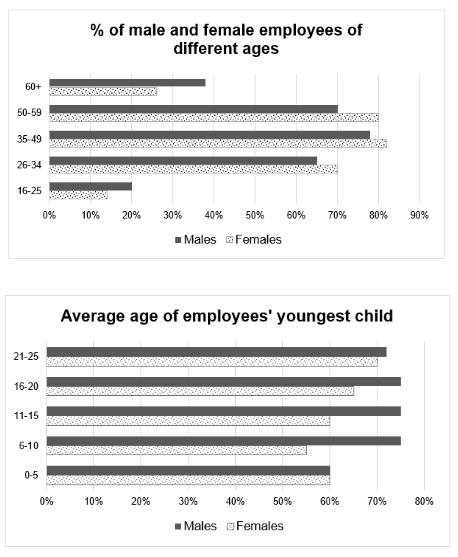 Regarding the age of employees' youngest child, 60% of males and females had a child no older than five years old. While the figure for males whose youngest child was in the 6-10, 11-15 and 16-20 groups was the same, at 75%, that for females ranged from 55% to 65%. Males and females whose child were in their twenties took up around 70%.