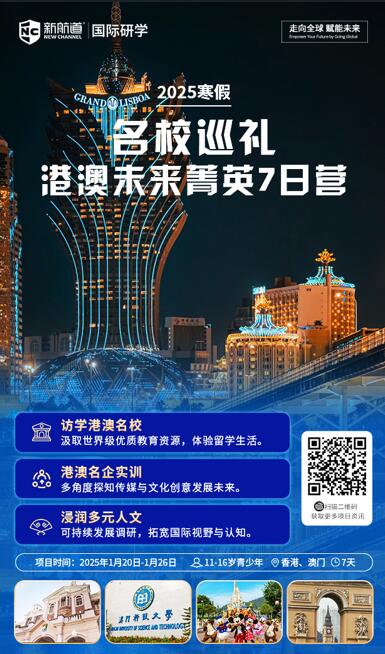 摘要:新航道國際研學走向全球 賦能未來。2025寒假名校巡禮港澳未來菁英7日營。訪學港澳名校汲取世界級優(yōu)質(zhì)教育資源,體驗留學生活。