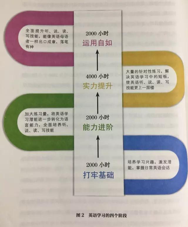 那么,作為家長如何可以把握住孩子學(xué)英語的黃金時(shí)期,合理規(guī)劃英語學(xué)習(xí)助孩子一臂之力呢?“我認(rèn)為,規(guī)劃要以提高英語能力為終極目標(biāo),以終為始,做好長遠(yuǎn)打算。”胡敏將6—18歲青少年時(shí)期的英語學(xué)習(xí)分成四個(gè)階段,為孩子打造了一個(gè)“10000個(gè)小時(shí)學(xué)習(xí)計(jì)劃”。(見圖二)