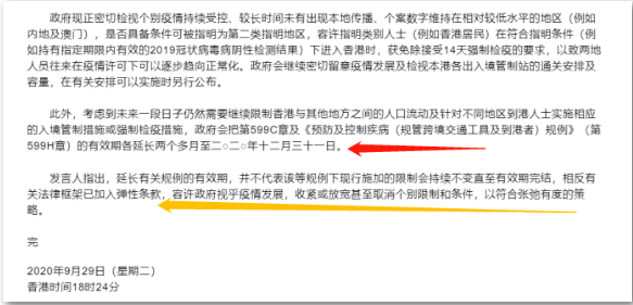雙節(jié)前,香港政府發(fā)布公告,將《若干到港人士強制檢疫規(guī)例》(第599C章)的有效期延長至2020年12月31日。規(guī)則實施期間,所有由內地入港的內地旅客都需要采取隔離措施14日。