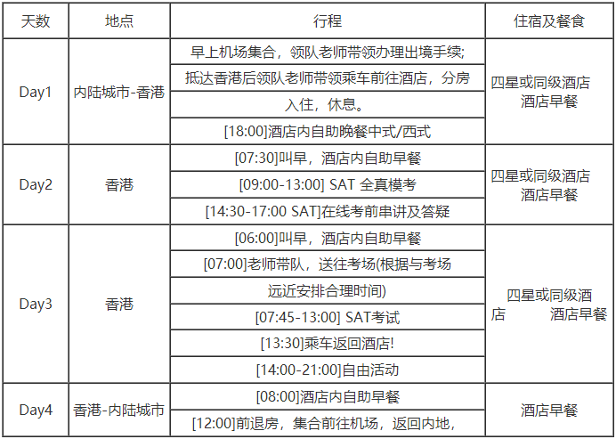 摘要:新航道SAT考團(tuán)小給大家?guī)?lái)10月2日香港SAT考團(tuán),已經(jīng)為大家安排的明明白白,可以說(shuō)是吃住行考,安心之選!