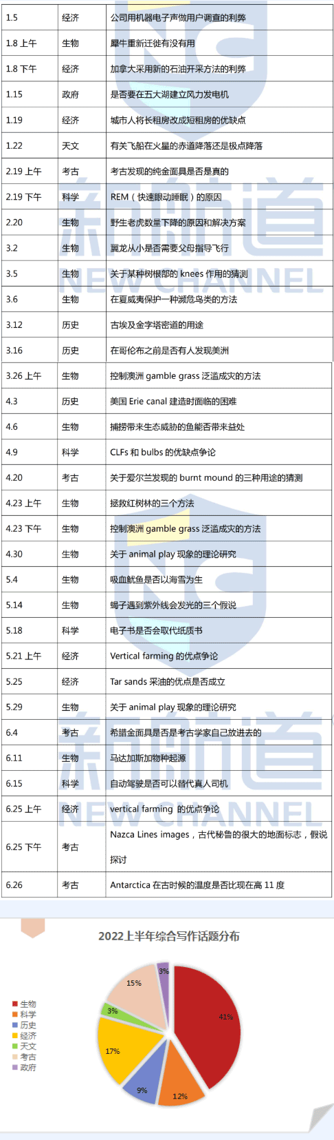 從比例分布圖我們可以清晰地看到,生物類依然是綜合寫作的大頭,在上半年考試中占到了41%,接近一半。在這其中,不乏出現以往考過的原題,比如犀牛遷徙,控制澳洲gamble grass等。同時,相較于以往年份的情況來看,考古類比例有所下降。經濟類和科學類所占到的比例也不小。