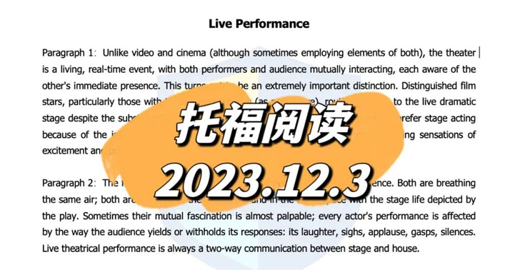 3. live performance in theater (重復2023.9.23/2023.10.28) 與視頻和電影不同 (雖然有時兩者都有) ,戲劇是一個活生生的、實時的事件,表演者和觀眾相互互動,每個人都意識到對方的即時存在。這是個極其重要的區別。杰出的電影明星,特別是那些有戲劇背景的人 (大多數都有),通常會回到現場戲劇舞臺,盡管電影工作有更大的經濟回報,他們總是更喜歡舞臺表演,因為戲劇提供了觀眾的即時反應,以及相應的興奮和存在感。
